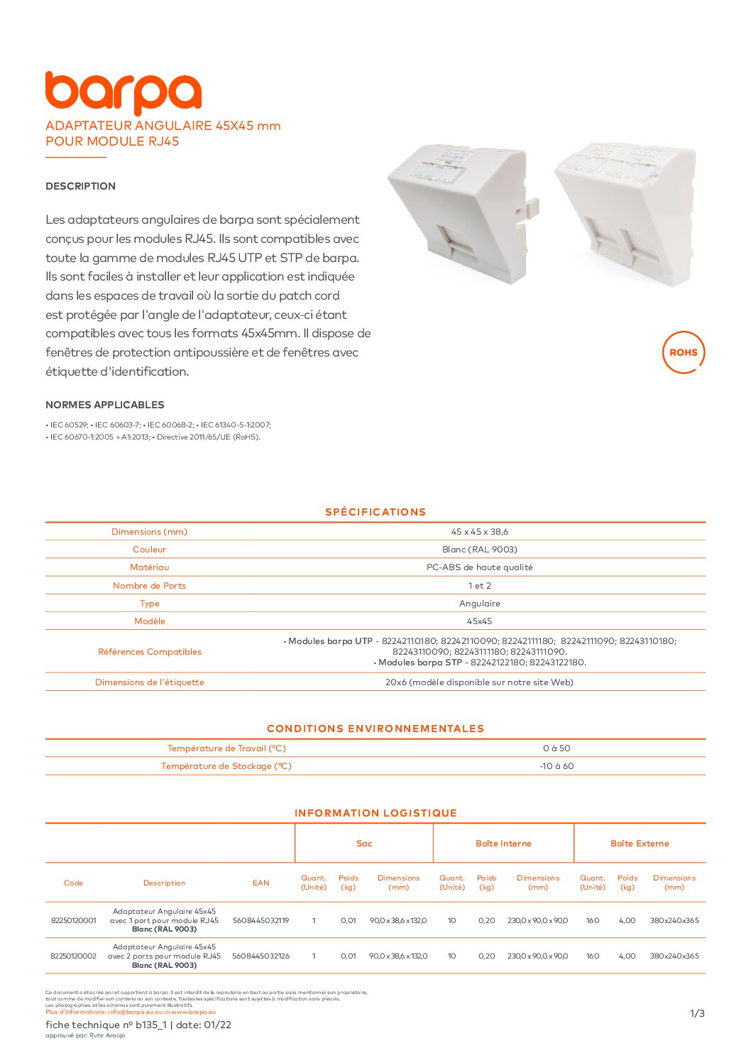 Adaptateur 45×45 Angulaire pour Module RJ45 – 1 ou 2 Portes – Fiche Technique