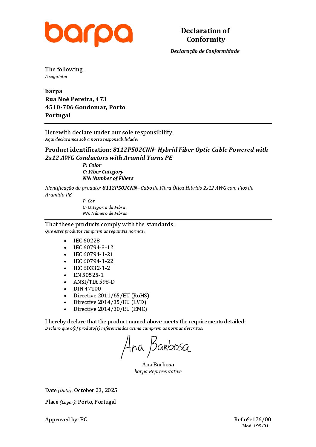 Câble Hybride 2×12 AWG Aramide – PE – Déclaration de Conformité